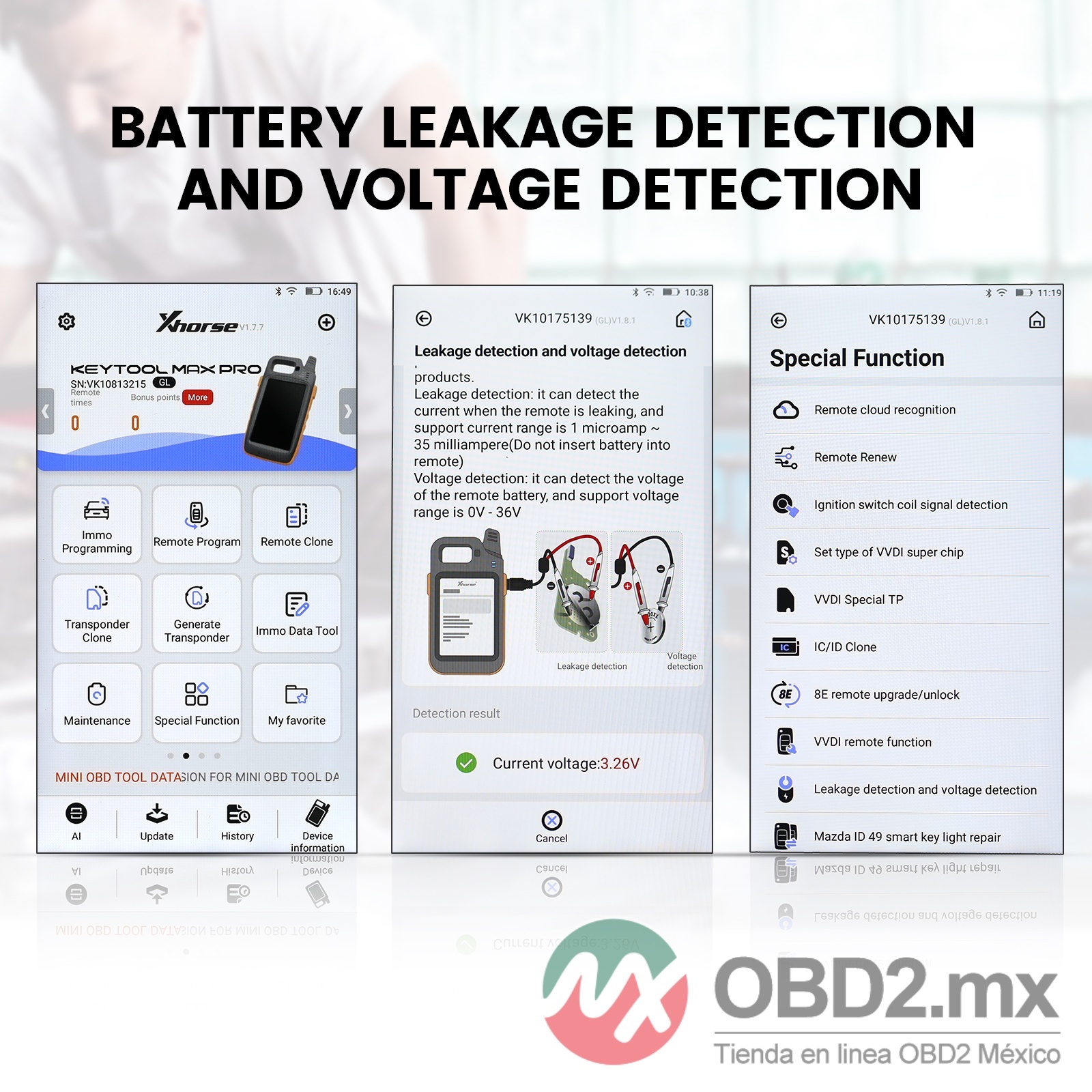 Combinando las necesidades de los cerrajeros automotrices con nuestras innovaciones, KEY TOOL MAX PRO cuenta con un nuevo módulo de prueba de batería. Simplemente conectándolo al cable de detección de fugas, Los usuarios pueden comprobar si una batería de control remoto presenta fugas eléctricas (rango: 1 μA a 35 μA) y detectar el voltaje de una batería de control remoto (rango: 0V a 36V).